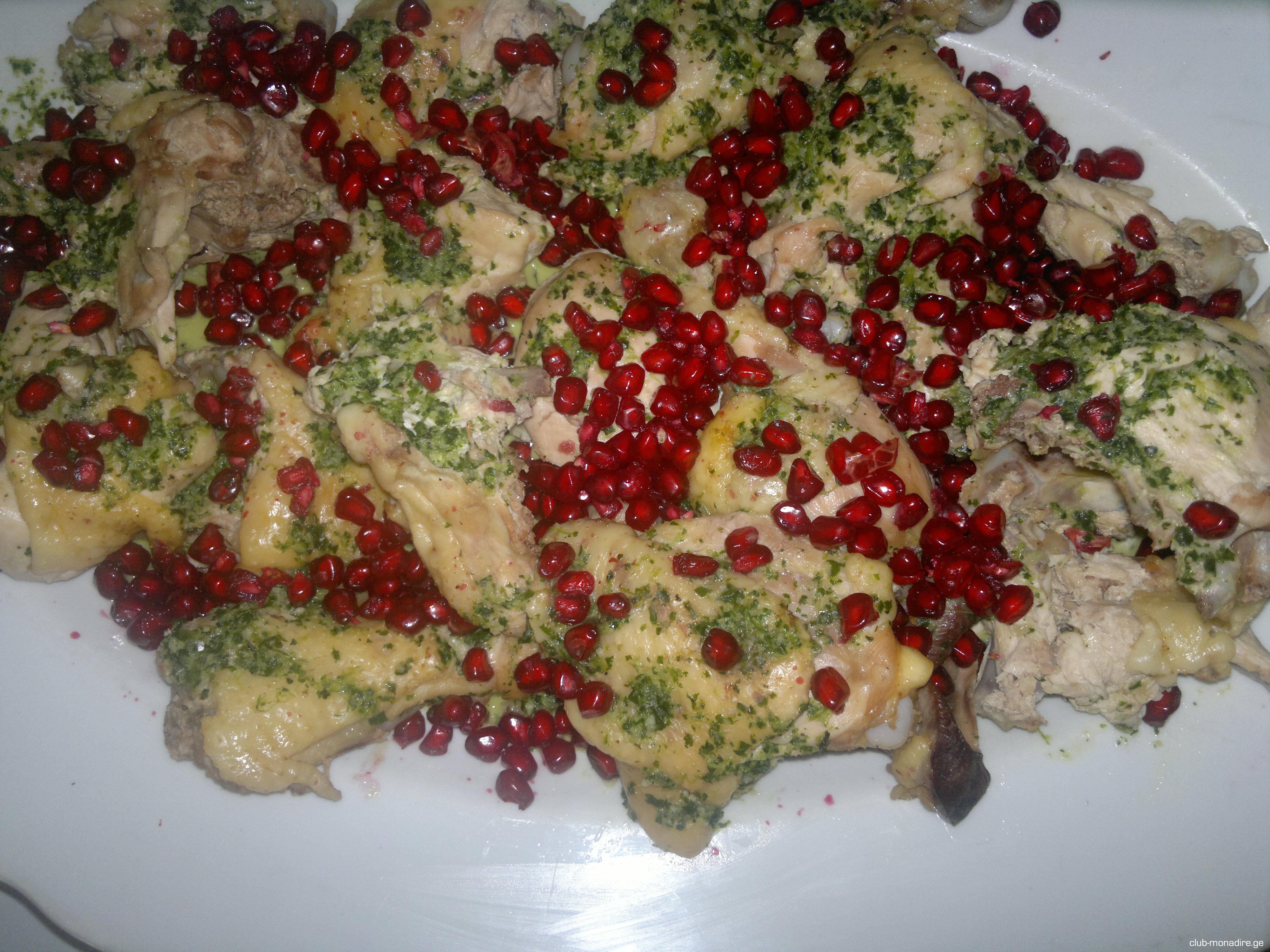 დედალი უნდა მოხარშო და დაჭრა ნაწილებად .. გურიაში ვამბობთ-აჩარიქება :) მოათავსო ბლუდზე.. დანაყე 2 კბილი ნიორი, ქინძი , საშკვლამი, ცოტა ყვითელი ყვავილის მწვანე ფოთლები( მე ვახმობ) ცოტა წითელი წიწაკა,, მერე წვენს მოხადე ცხიმი, ცოტა წვენი დაამატე .(ძმარი არ უნდა ) ბროწეულები და მოასხი ქათამს.. ეს არის და ეს